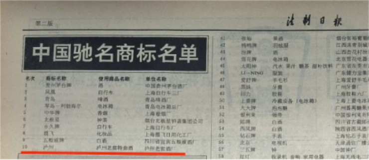 最终,泸州牌(酒)与凤凰牌(自行车)、琴岛·利勃海尔(电冰箱)等商标成功入选“中国(十大)驰名商标”,成为了那个年代的中国品质代表。