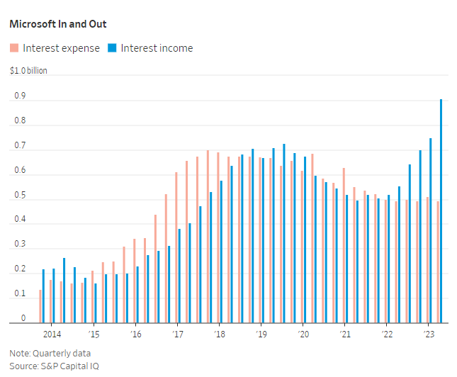 以全球第二大市值公司微软为例。它拥有比债务更多的现金和短期投资,因此它永远不会受到更高利率的威胁。它固定了借款成本,最近一个季度,该公司支付的利息与去年同期完全相同,为4.92亿美元。不过,该公司在现金和短期投资方面的收益大幅增加,年化收益率从2.1%上升至3.3%左右,再加上其现金储备小幅增加至1110亿美元,仅在本季度就获得了9.05亿美元的利息,高于此前的5.52亿美元。