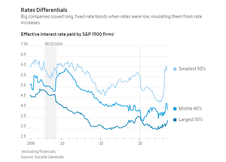 如果将市场按规模划分,显然最大的公司受加息影响最小。根据法国兴业银行量化研究主管安德鲁•拉普索恩(Andrew Lapthorne)的计算,标普综合1500指数成份股中最大的十分之一公司支付的利率仅略高于此前低点,但仍低于疫情前的峰值。该指数中规模最小的一半公司支付的利率已升至10多年来的最高水平,而规模居中的一半公司的利率大致回到了疫情前的水平。