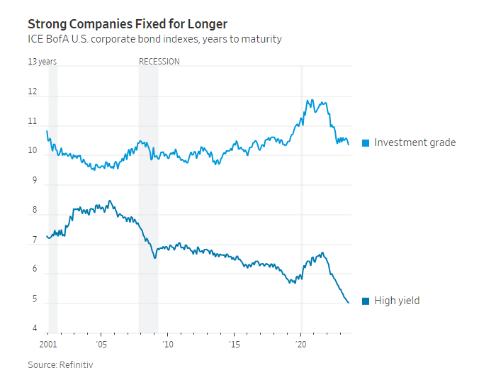 高利率的赢家是高质量的借款人,他们在疫情期间锁定了低利率,债券的到期时间比本世纪任何时候都要更长。因此,更高的利率对他们的借贷成本几乎没有直接的影响,而他们的现金储备却能获得更多的收益。