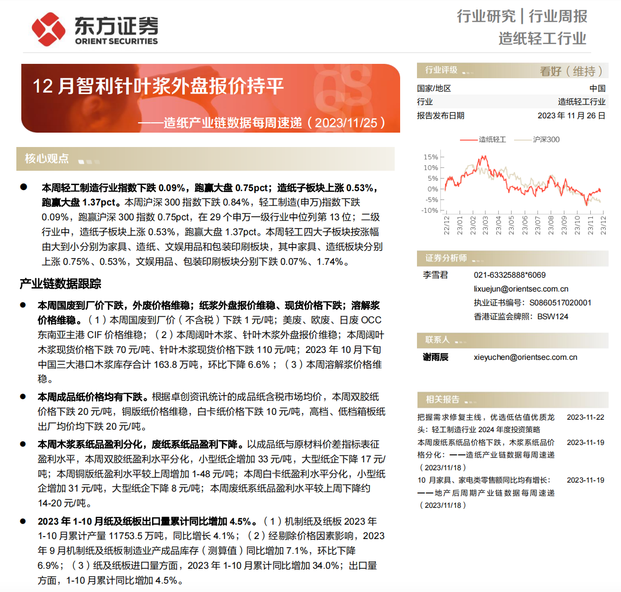 12月智利针叶浆外盘报价持平——造纸产业链数据每周速递.pdf