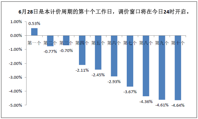 成品油:中国汽、柴油批发价格显示,6月27日中国汽、柴油批发价格下跌。全国92#汽油平均批发价格为9702元/吨,较24日下跌26元/吨;柴油(含低凝点)平均批发价格为8747元/吨,较24日下跌29元/吨。当日市场整体情况来看,尽管国际油价24日上涨,但6月28日24时国内成品油零售价格即将迎来下调,消息面支撑不足,此外,受近期强降雨影响,国内汽、柴油需求表现疲弱,市场购销气氛清淡。