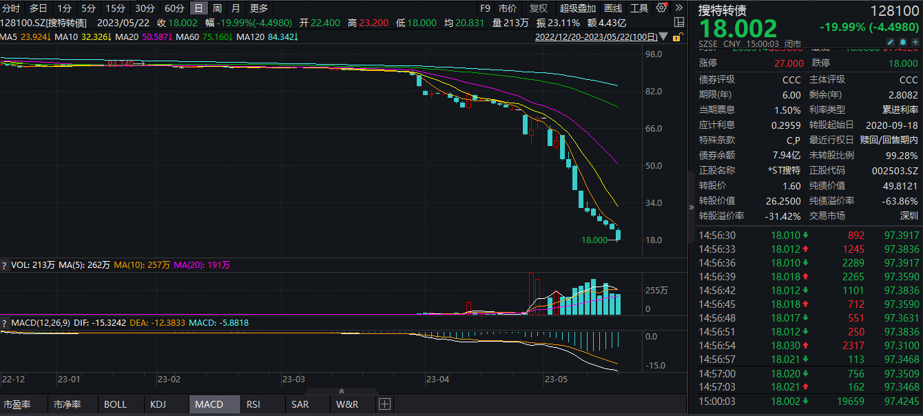 新华财经北京5月22日电(王菁)资本市场周一(22日)见证了搜特转债成为首只被强制退市的可转债。截至5月22日收盘,搜于特集团股份有限公司(简称“搜于特”)旗下的“搜特转债”(128100)全天大跌19.99%,收报18.002元/张,创市场新低,也成为首只受正股拖累而强制退市的个券。