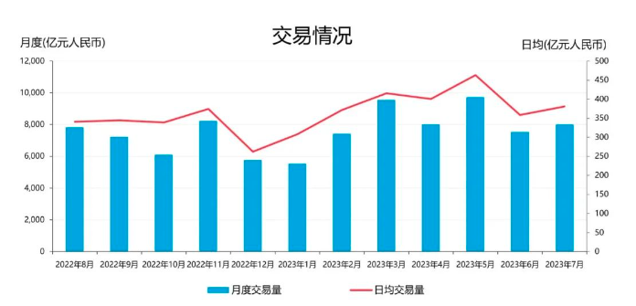截至7月末,债券通获批入市投资者数量共808家,月度增加6家机构;从交易情况来看,当月国债和政策性金融债交易最为活跃,分别占总交易量的43%和43%。